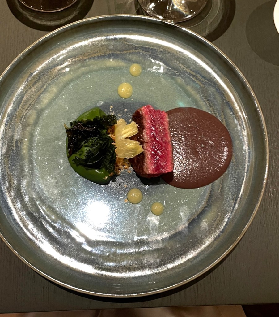 This worked because the structure held: salt sharpened the fat, acidity lifted without puncturing, texture remained intact. Paired with a restrained Kopke white blend, low in alcohol and high in line, the dish stayed vertical. Nothing sagged.